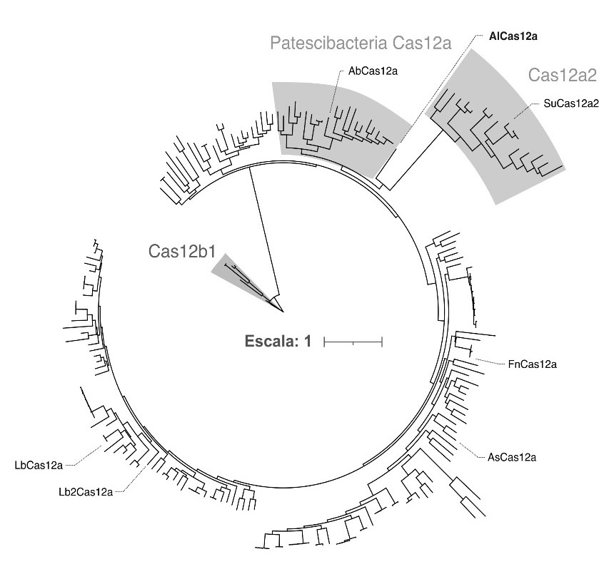 Figure 1: Phylogenetic relationships between Cas12 proteins using a phylogenetic tree of AlCas12a, proteins assigned to the Cas12a family, including orthologs from Patescibacteria (shaded), members of the Cas12a group (shaded) and orthologs from the Cas12b1 family (shaded).