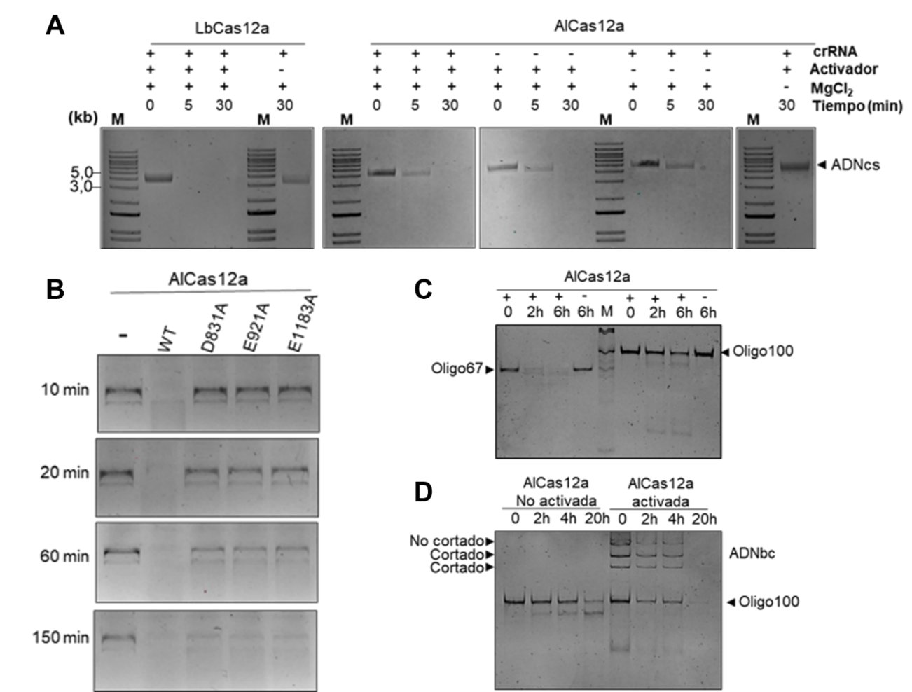 2. Guide-dependent nonspecific cleavage (in trans): once activated by binding to its target, AlCas12a can degrade any single-stranded DNA (ssDNA) molecule (see Figure 3: images A and D). This behaviour, similar to that of other Cas12a, has been exploited for nucleotide detection in molecular diagnostics.