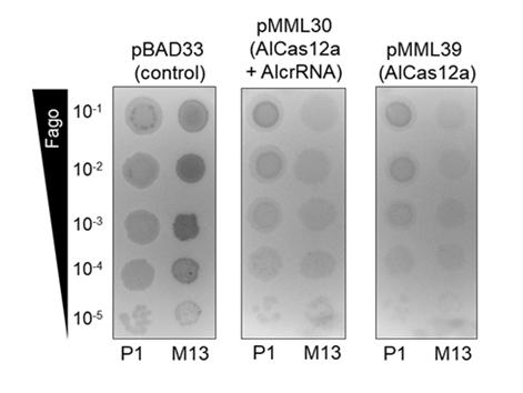 In experiments with bacteria expressing AlCas12a, a significant reduction in susceptibility to single-stranded (M13) and double-stranded (P1) DNA viruses was observed, even when the enzyme was not targeted to a specific sequence (see Figure 4).